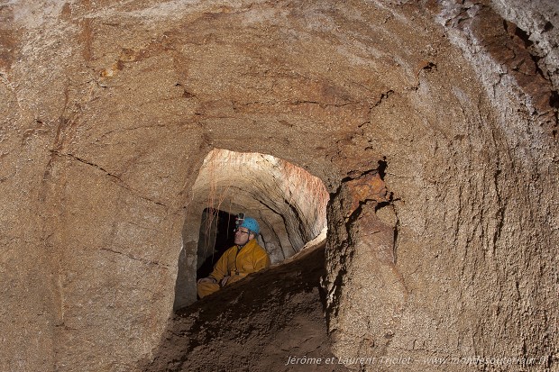 Communication entre les deux chambres d’un souterrain localisé dans le nord-est de la Bretagne ; de la terre en provenance d’un effondrement encombre le passage (Bretagne, France). [1189N076 © Jérôme et Laurent Triolet/www.mondesouterrain.fr]